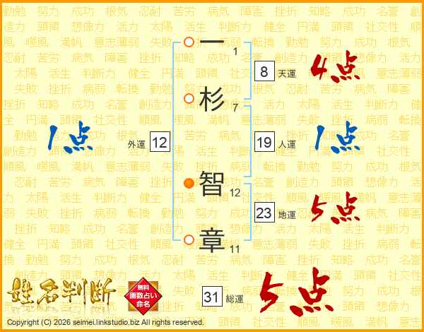 あなたの人生を表す1番重要な運勢です。生涯を通じて影響する総合運となり、主に50歳以降の晩年期に影響を及ぼします。苗字と名前の合計画数。