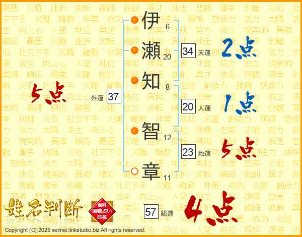 伊(6画)瀬(20画)知(8画) 智(12画)章(11画)