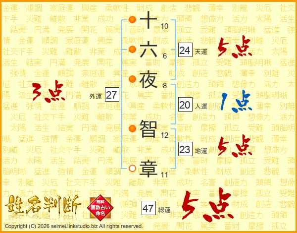 生活面を象徴する運勢です。外部から受ける影響力を表し、結婚運、家庭運や職場、環境への順応性を表します。総運から人運を引いた画数。姓や名が1文字の場合を除く。