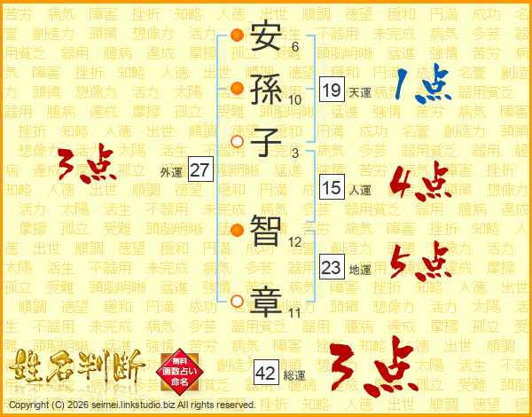 安(6画)孫(10画)子(3画) 智(12画)章(11画)