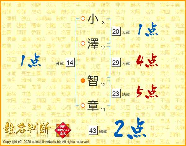 小(3画)澤(17画) 智(12画)章(11画)