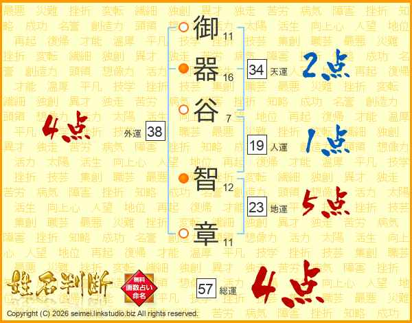 御(11画)器(16画)谷(7画) 智(12画)章(11画)