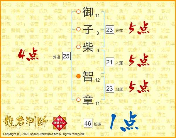 御(11画)子(3画)柴(9画) 智(12画)章(11画)