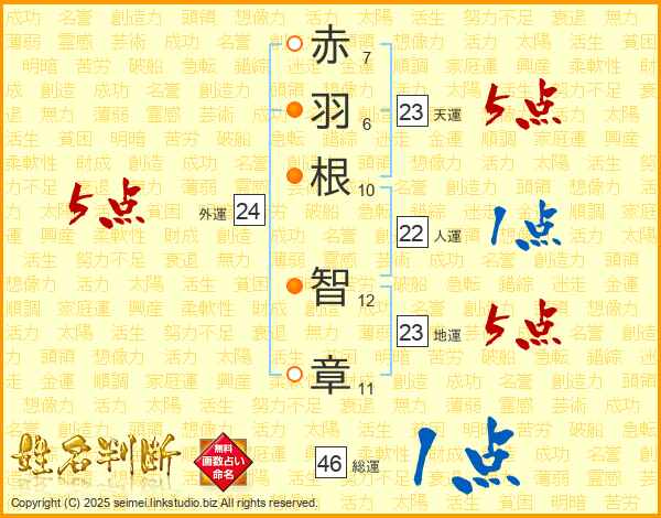 赤(7画)羽(6画)根(10画) 智(12画)章(11画)