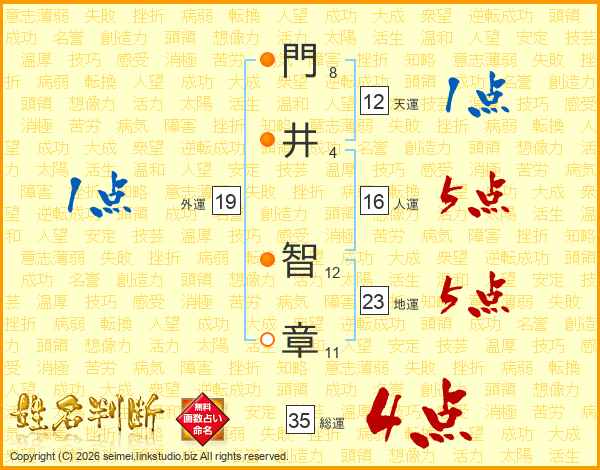 門(8画)井(4画) 智(12画)章(11画)