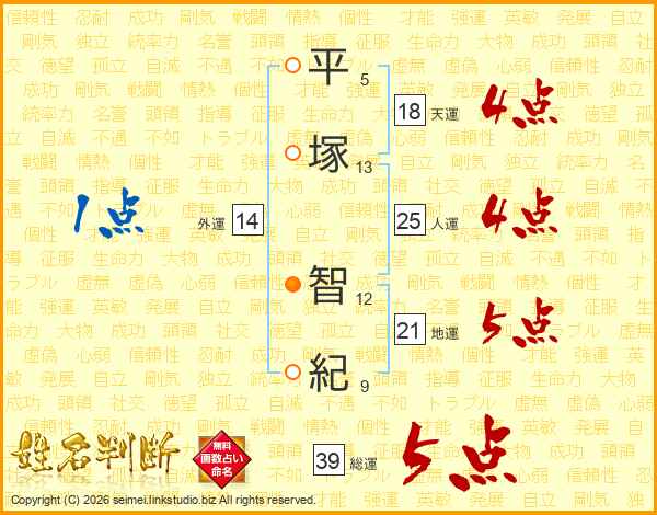 平塚智紀さんの総運は39画の5点!