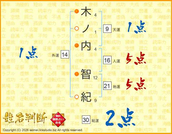木ノ内智紀さんの総運は30画の2点!