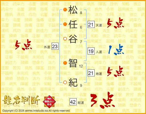 松(8画)任(6画)谷(7画) 智(12画)紀(9画)