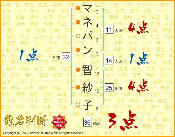 マ(2画)ネ(4画)パ(3画)ン(2画) 智(12画)紗(10画)子(3画)