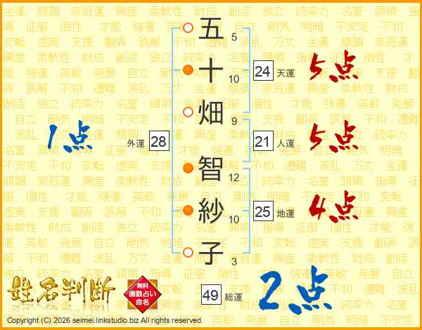 五(5画)十(10画)畑(9画) 智(12画)紗(10画)子(3画)