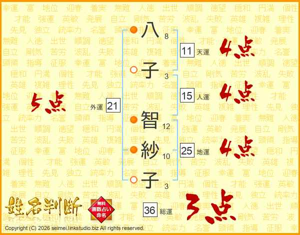 八(8画)子(3画) 智(12画)紗(10画)子(3画)