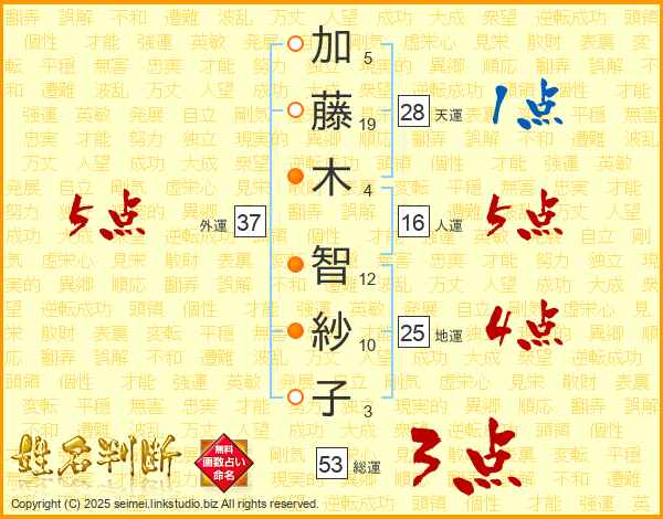 加(5画)藤(19画)木(4画) 智(12画)紗(10画)子(3画)
