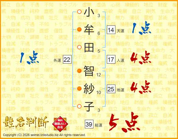 小(3画)牟(6画)田(5画) 智(12画)紗(10画)子(3画)