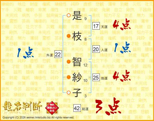 是(9画)枝(8画) 智(12画)紗(10画)子(3画)