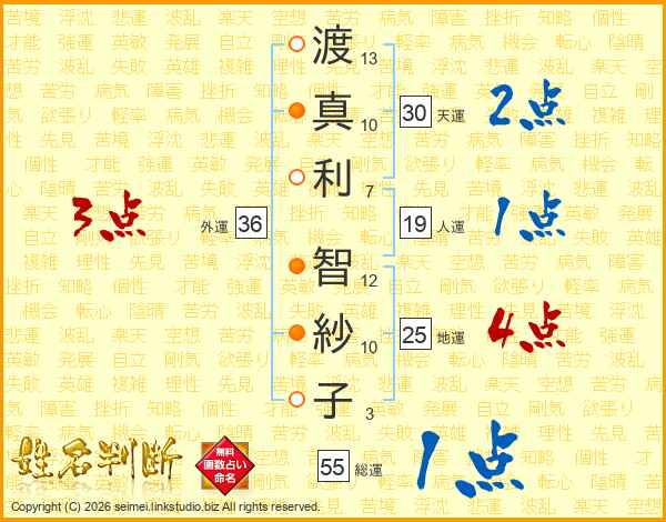渡(13画)真(10画)利(7画) 智(12画)紗(10画)子(3画)