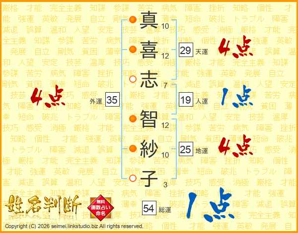 真(10画)喜(12画)志(7画) 智(12画)紗(10画)子(3画)
