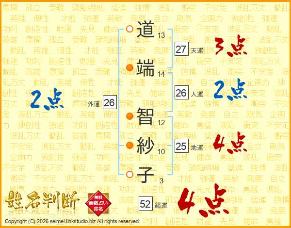 道(13画)端(14画) 智(12画)紗(10画)子(3画)