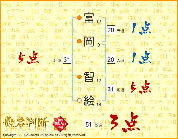 富(12画)岡(8画) 智(12画)絵(19画)