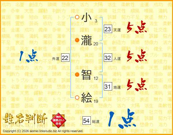 小(3画)瀧(20画) 智(12画)絵(19画)