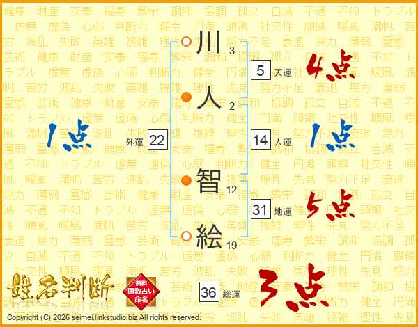 生活面を象徴する運勢です。外部から受ける影響力を表し、結婚運、家庭運や職場、環境への順応性を表します。総運から人運を引いた画数。姓や名が1文字の場合を除く。