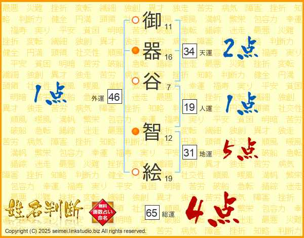 御(11画)器(16画)谷(7画) 智(12画)絵(19画)