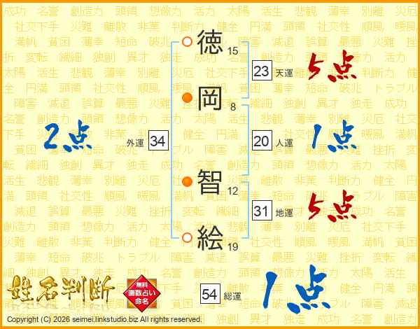 徳(15画)岡(8画) 智(12画)絵(19画)