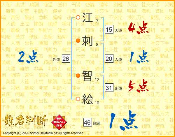 生活面を象徴する運勢です。外部から受ける影響力を表し、結婚運、家庭運や職場、環境への順応性を表します。総運から人運を引いた画数。姓や名が1文字の場合を除く。