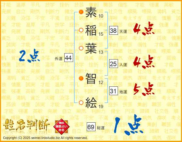 素(10画)稲(15画)葉(13画) 智(12画)絵(19画)