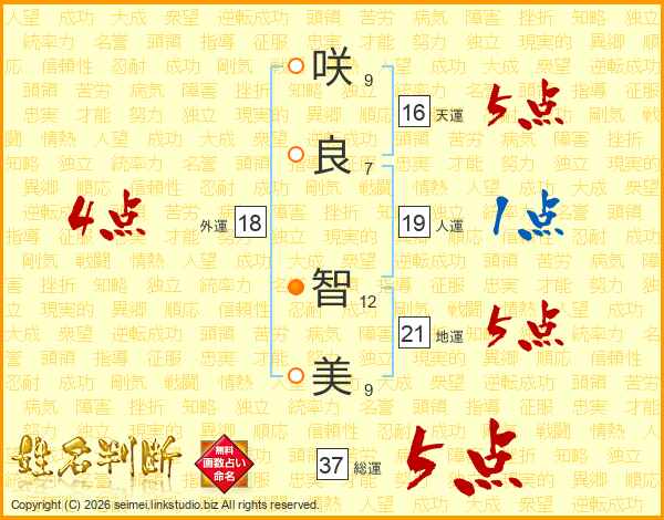 咲(9画)良(7画) 智(12画)美(9画)