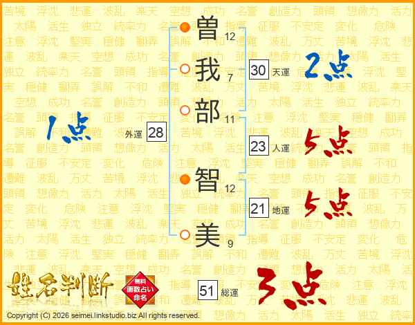 曽(12画)我(7画)部(11画) 智(12画)美(9画)