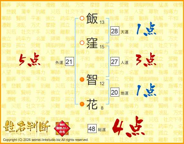 生活面を象徴する運勢です。外部から受ける影響力を表し、結婚運、家庭運や職場、環境への順応性を表します。総運から人運を引いた画数。姓や名が1文字の場合を除く。