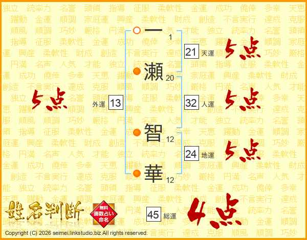 生活面を象徴する運勢です。外部から受ける影響力を表し、結婚運、家庭運や職場、環境への順応性を表します。総運から人運を引いた画数。姓や名が1文字の場合を除く。