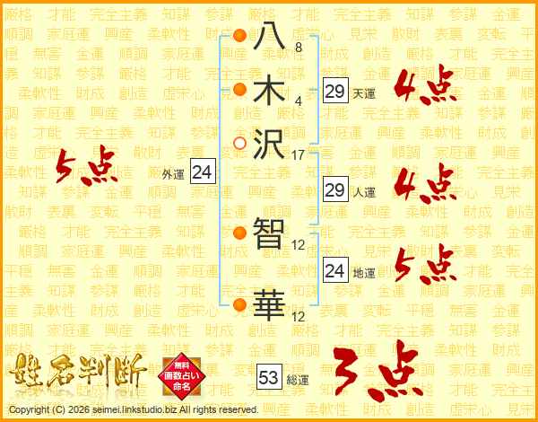 八(8画)木(4画)沢(17画) 智(12画)華(12画)