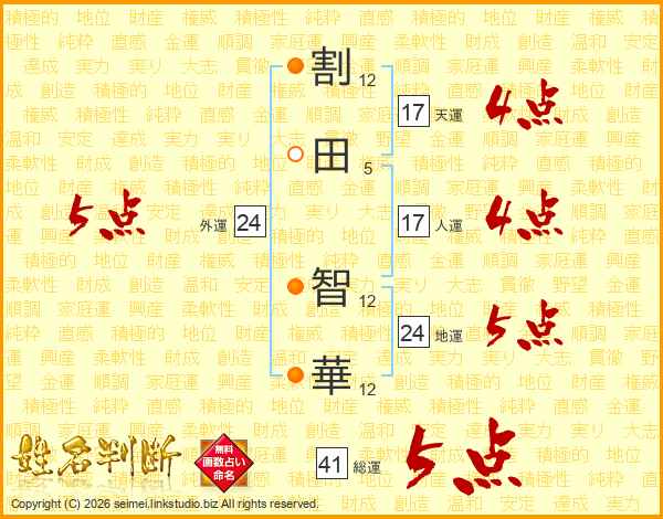 割(12画)田(5画) 智(12画)華(12画)