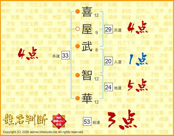 喜(12画)屋(9画)武(8画) 智(12画)華(12画)
