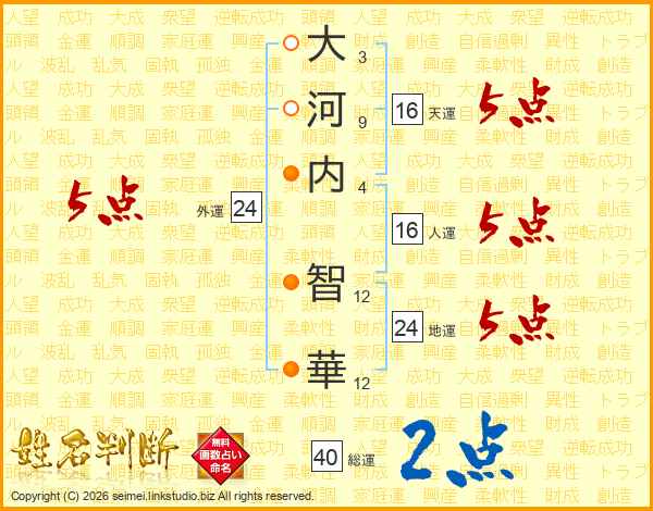 大(3画)河(9画)内(4画) 智(12画)華(12画)