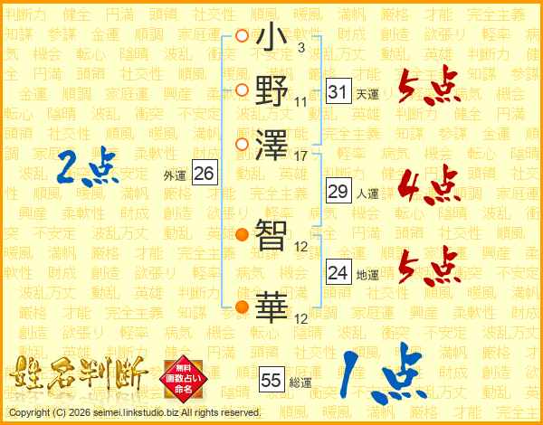 小(3画)野(11画)澤(17画) 智(12画)華(12画)