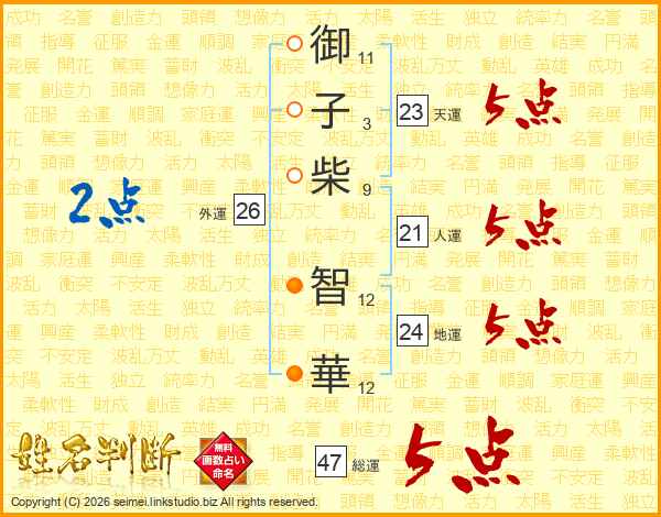 御(11画)子(3画)柴(9画) 智(12画)華(12画)