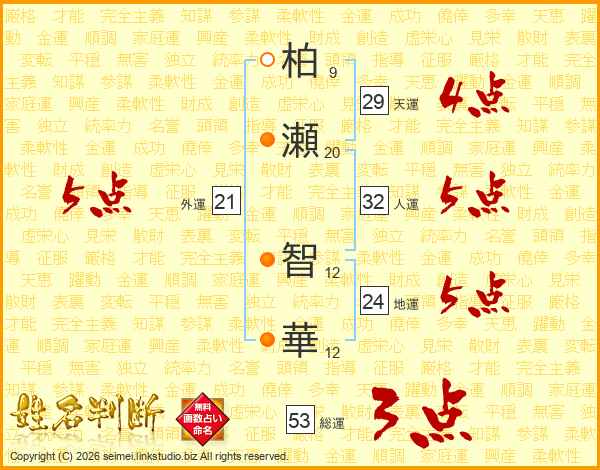柏(9画)瀬(20画) 智(12画)華(12画)