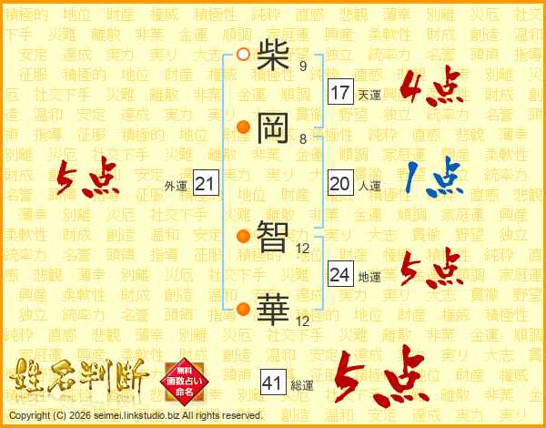 柴(9画)岡(8画) 智(12画)華(12画)