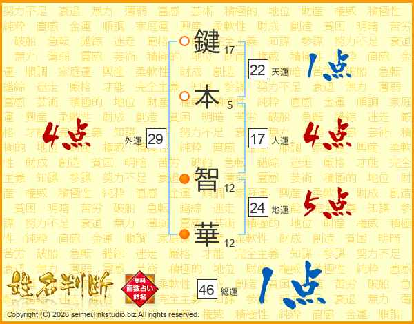 生活面を象徴する運勢です。外部から受ける影響力を表し、結婚運、家庭運や職場、環境への順応性を表します。総運から人運を引いた画数。姓や名が1文字の場合を除く。