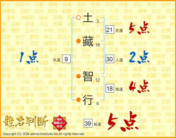 あなたの人生を表す1番重要な運勢です。生涯を通じて影響する総合運となり、主に50歳以降の晩年期に影響を及ぼします。苗字と名前の合計画数。