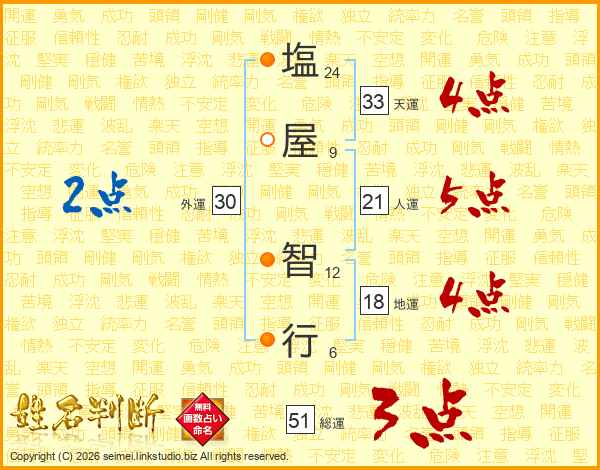 あなたの人生を表す1番重要な運勢です。生涯を通じて影響する総合運となり、主に50歳以降の晩年期に影響を及ぼします。苗字と名前の合計画数。
