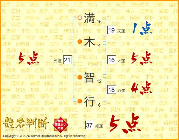 満(15画)木(4画) 智(12画)行(6画)