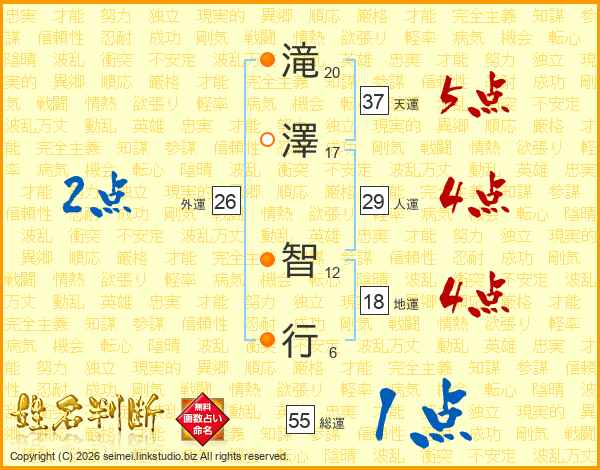 滝(20画)澤(17画) 智(12画)行(6画)