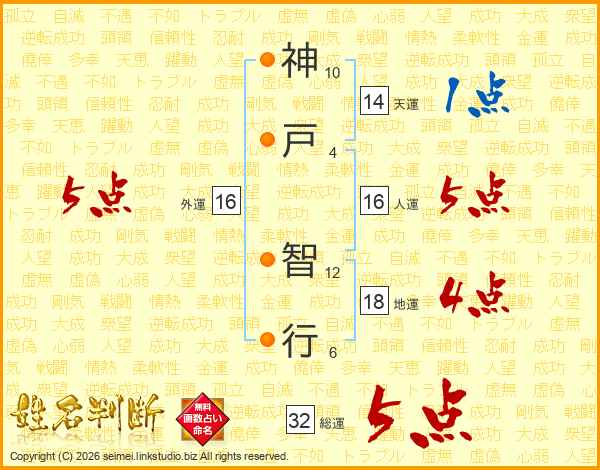 神戸智行さんの総運は32画の5点!