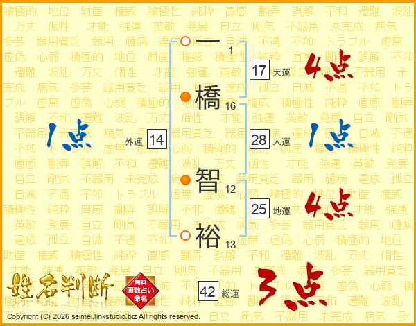 一(1画)橋(16画) 智(12画)裕(13画)