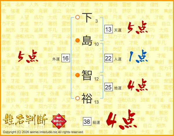 あなたの人生を表す1番重要な運勢です。生涯を通じて影響する総合運となり、主に50歳以降の晩年期に影響を及ぼします。苗字と名前の合計画数。