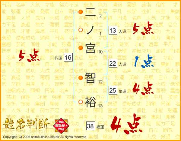 二(2画)ノ(1画)宮(10画) 智(12画)裕(13画)