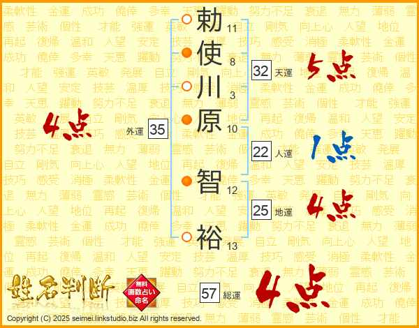 勅(11画)使(8画)川(3画)原(10画) 智(12画)裕(13画)
